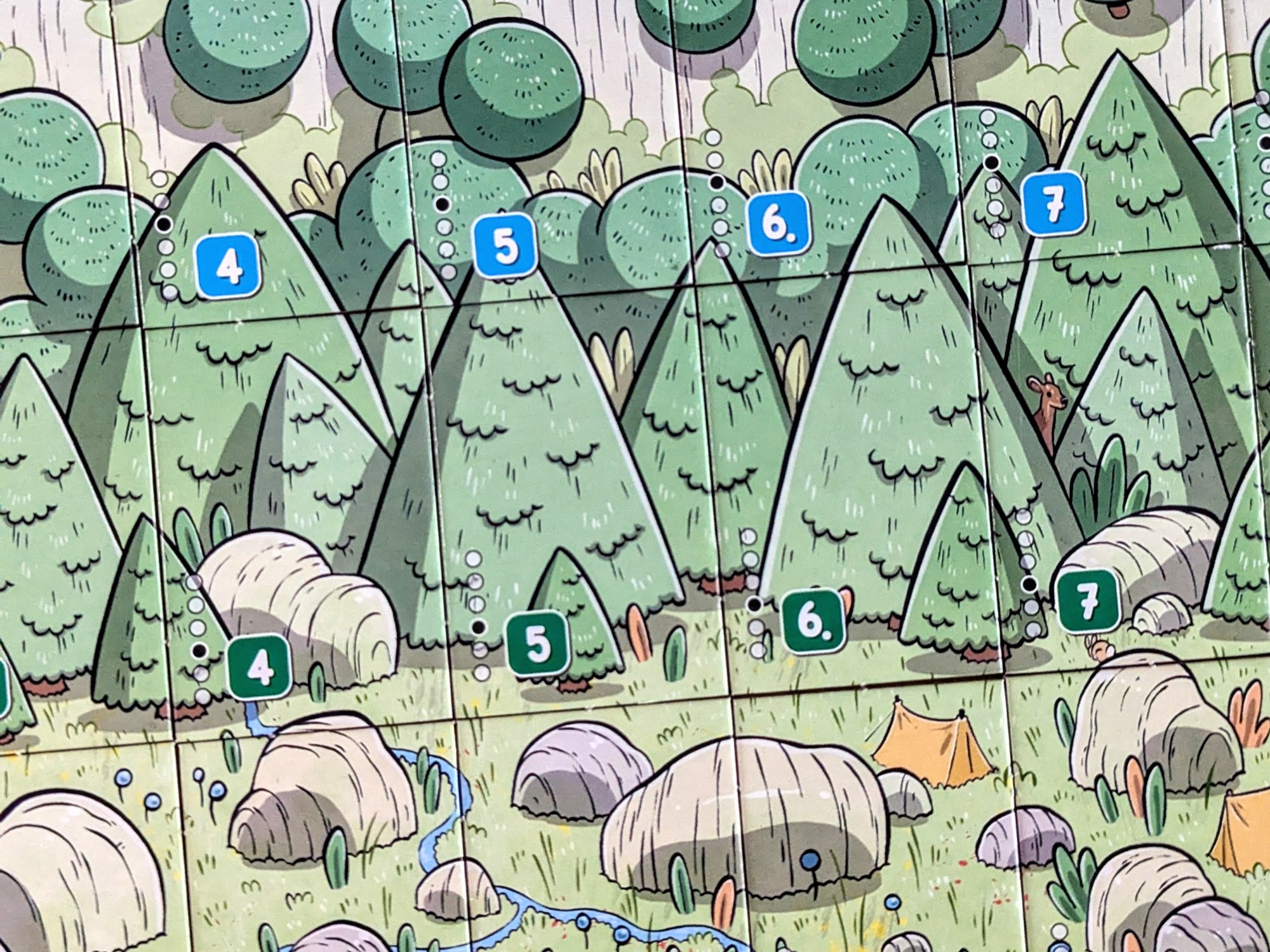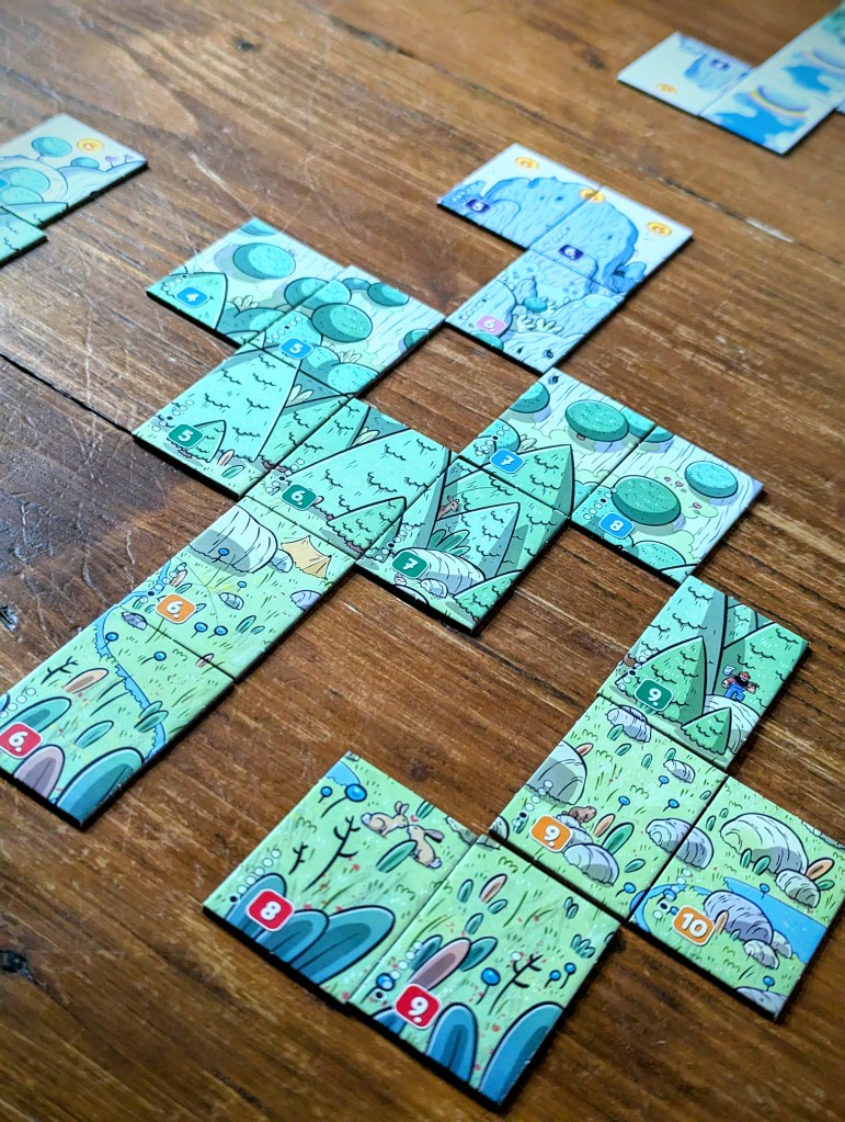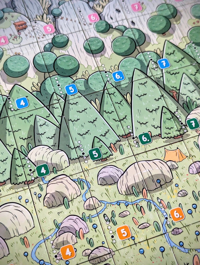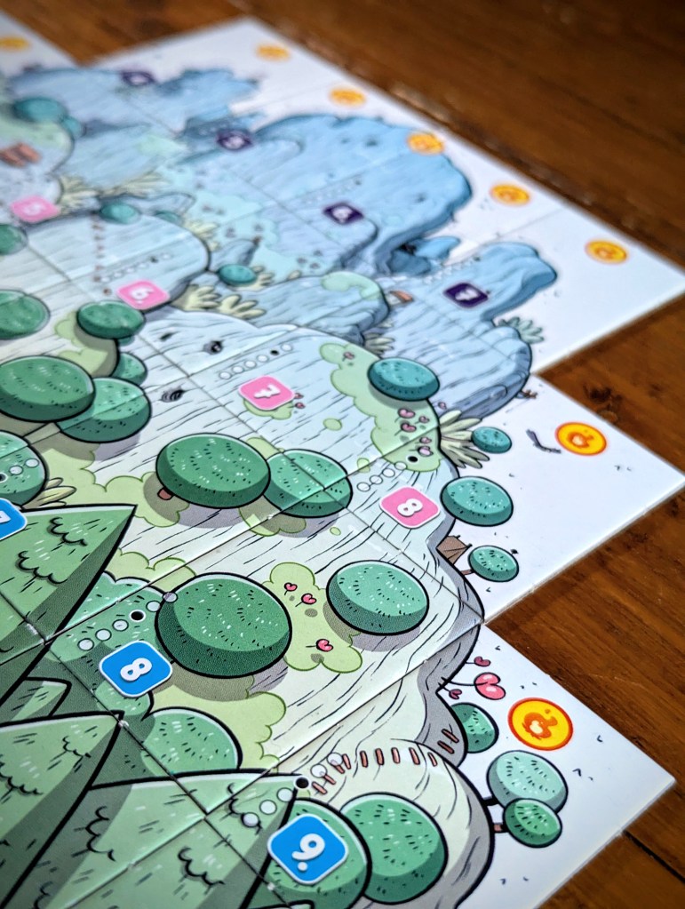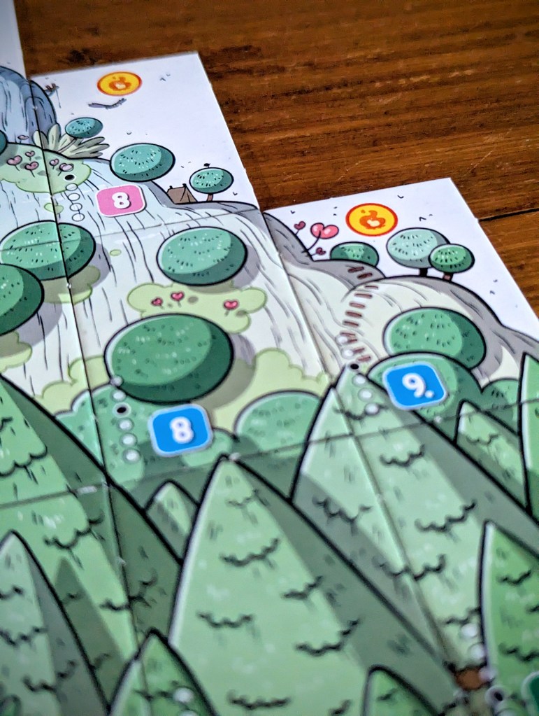 Each land tile goes in a specific ‘space’ on the mountain, in colour-coded rows and ascending numerical sequence. The player aid helps with the spatial locations, but it’s still tricky to place them perfectly when there’s tiles missing so it feels like you’re constantly tweaking your panorama as it fills up. There are promotional paper mats (or fancier neoprene ones to buy) if you can find them, which would make a big difference. In my opinion, paper mats should be included as standard because not only does it help with placement, it makes such a visual difference (as you can see from these photos, without a mat the gappy panoramas don’t look the prettiest).