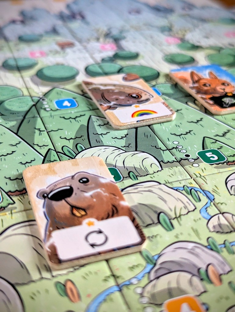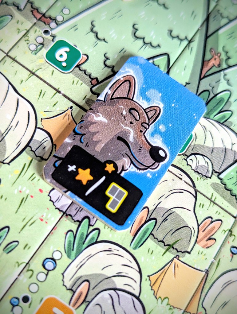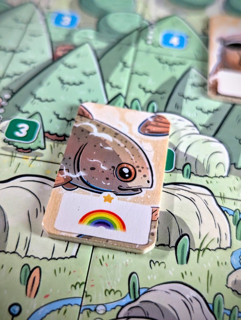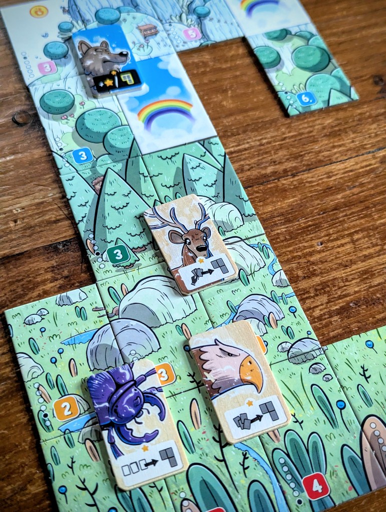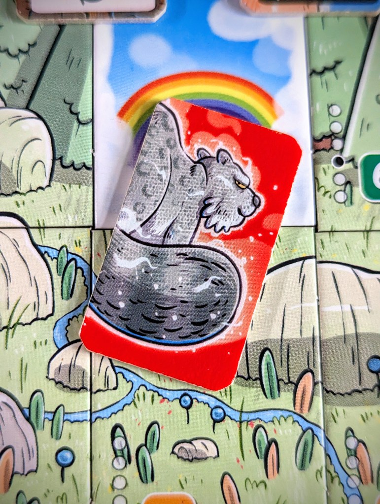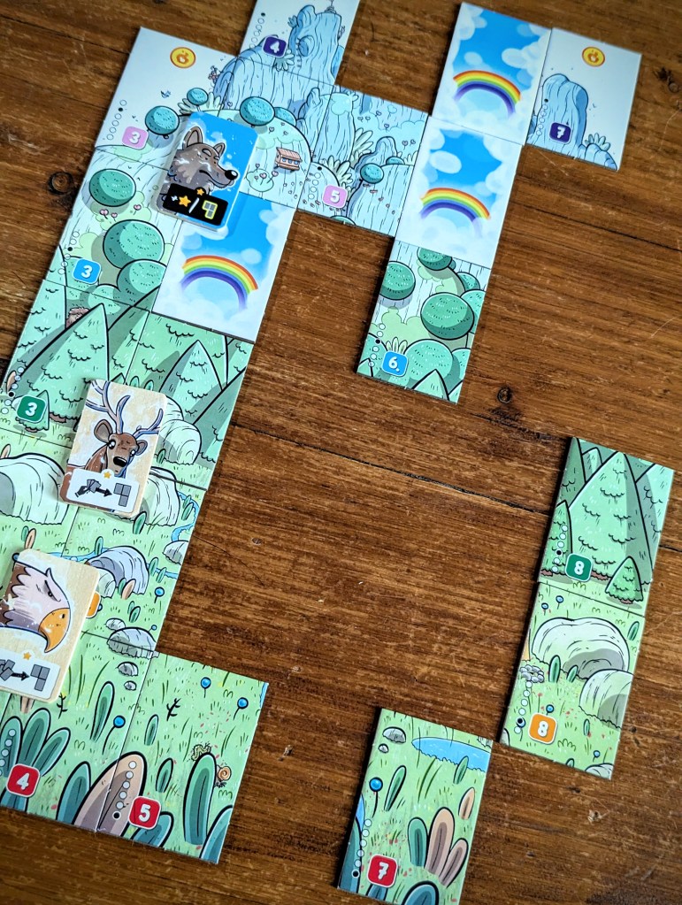 Solistis is cute and portable, with some adorable artwork from Gorobeï, particularly the different animal spirits that somehow manage to portray a lot of personality. The art on the land tiles seamlessly join together to make one whole mountain panorama, although you won’t achieve that in-game with your opponent grabbing half the tiles. I also really enjoyed the tactility of the wooden spirit tiles. The player aid, which has spirit powers on one side and the land tile arrangement on the other, is super useful but it would have been better if there was one for each player.