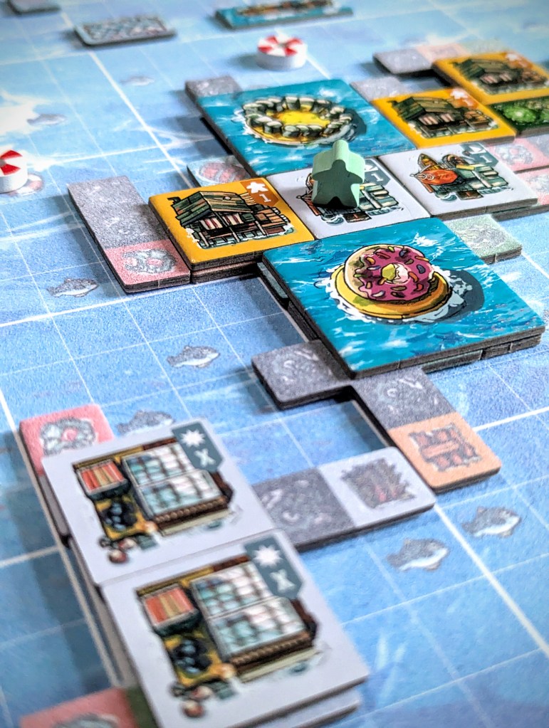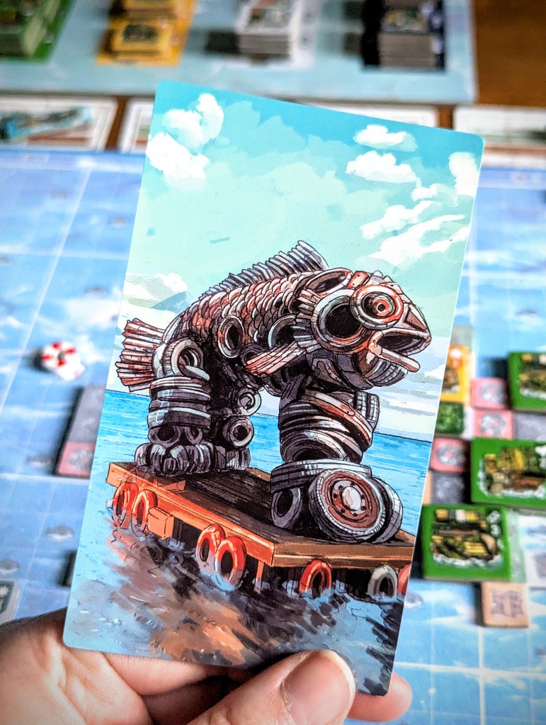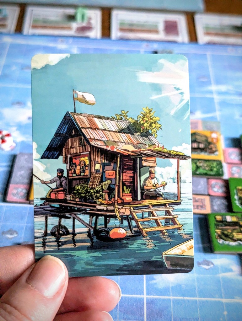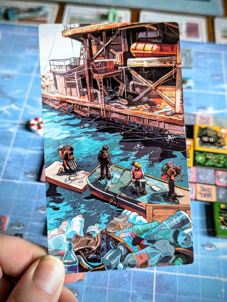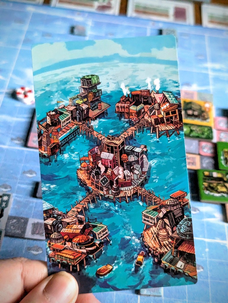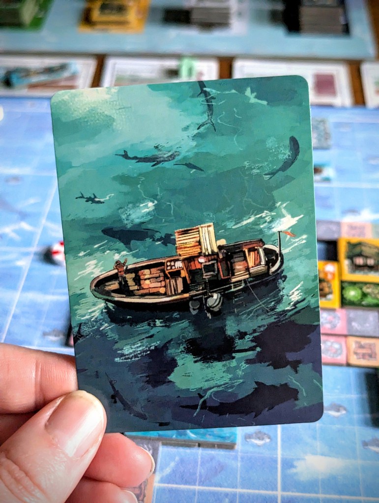 Water World is one of Matt’s favourite films when he was growing up, so the theme was an instant win for him – although the design is more cozy survivor core than weird dystopian Smokers (a good thing, in my opinion). The tiles and ocean boards have clear visuals without looking too busy and there is so much rich artwork on the back of the cards, they are an absolute treat to look at!