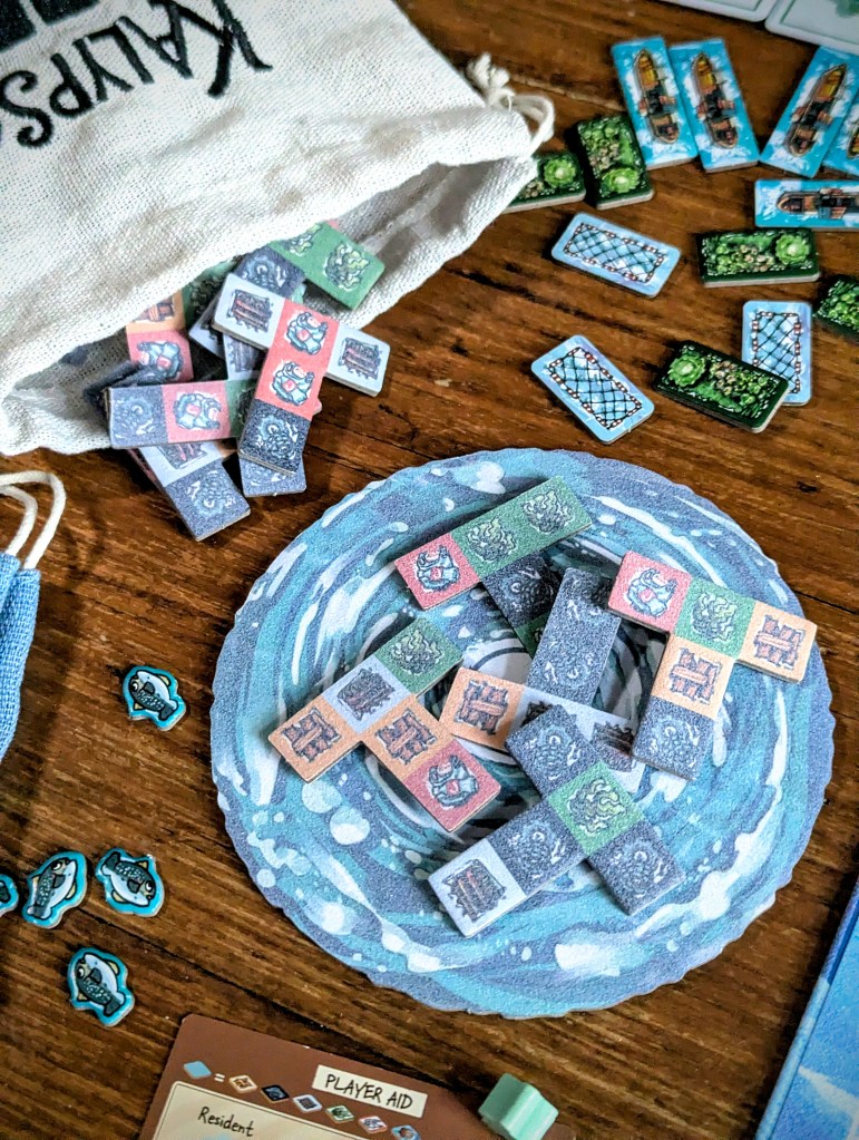 In Kalypso, players are – either competitively or cooperatively – building their own Water World, arranging salvaged polyomino scraps to build upon. Each turn you select a salvage T tile from your ‘vortex’ and place it alongside other tiles in your settlement. Create 2×2 squares containing at least 3 identical salvage types and you can build a matching structure and activate its effect. Make a 3×3 space including at least 5 of the same salvage (any type) and you can place a monument – these don’t have effects but are worth a hefty 11 points in competitive play. After you place your salvage tile the vortexes with remaining salvage are passed around, giving you a different selection to choose from.