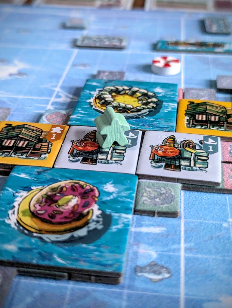 But perhaps most important of all are the Houses. Each house you build lets you place one survivor onto a different unoccupied building and this lets you trigger that building’s effect again. In competitive mode, you start with 2 survivors and you can rescue more by covering life raft tokens with your tiles. In co-operative mode, more survivors wash up on your central island at the start of each round (how many depend on difficulty), and if you don’t house them before the round ends you lose!