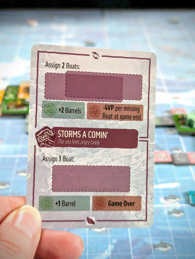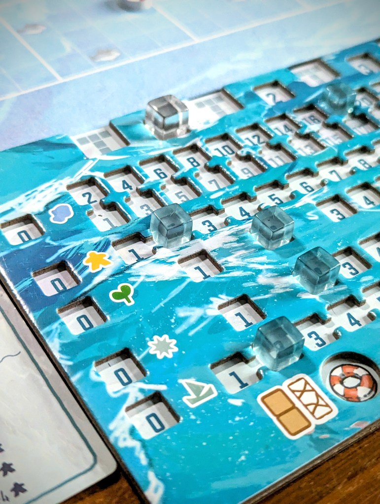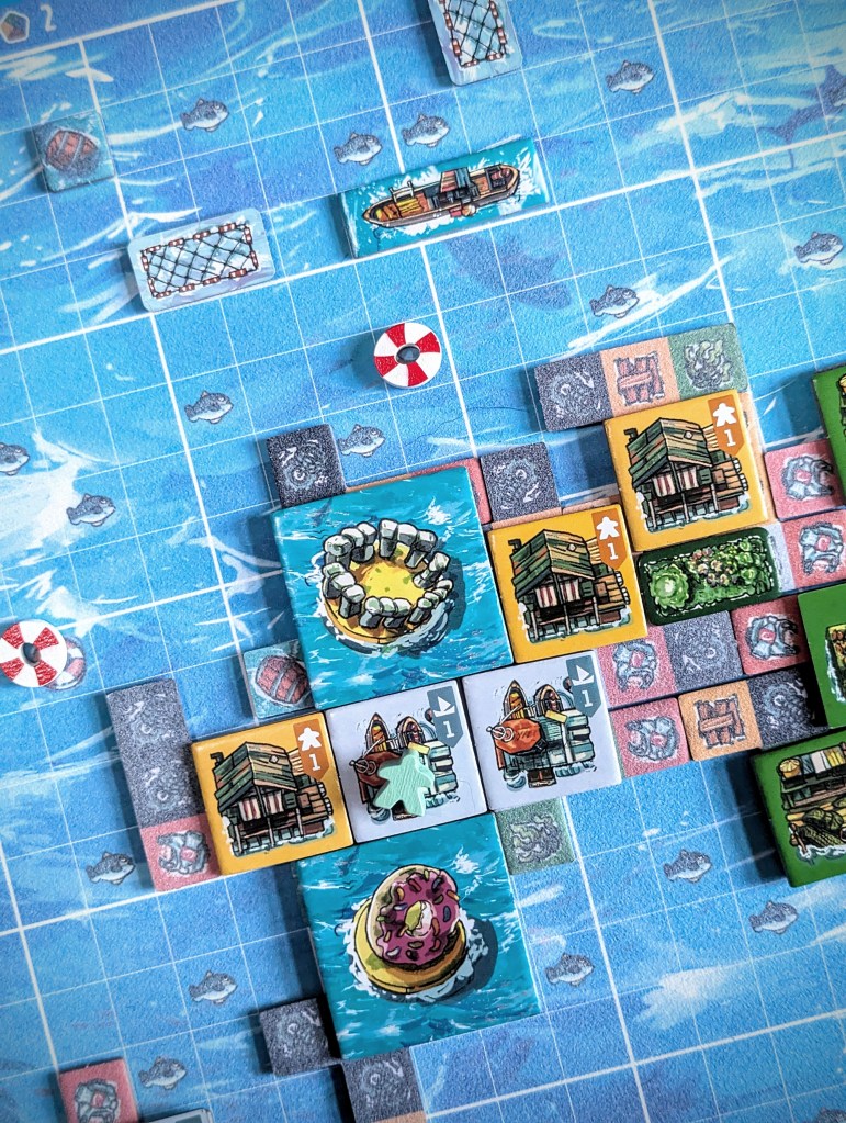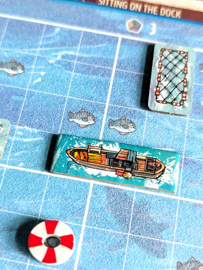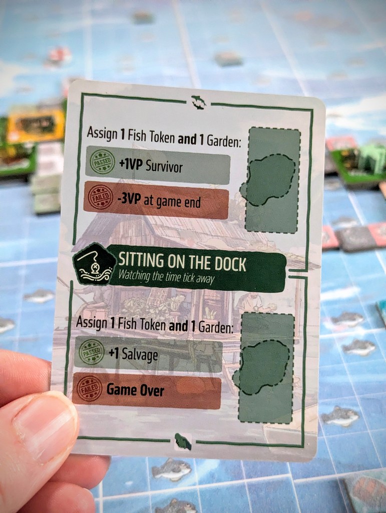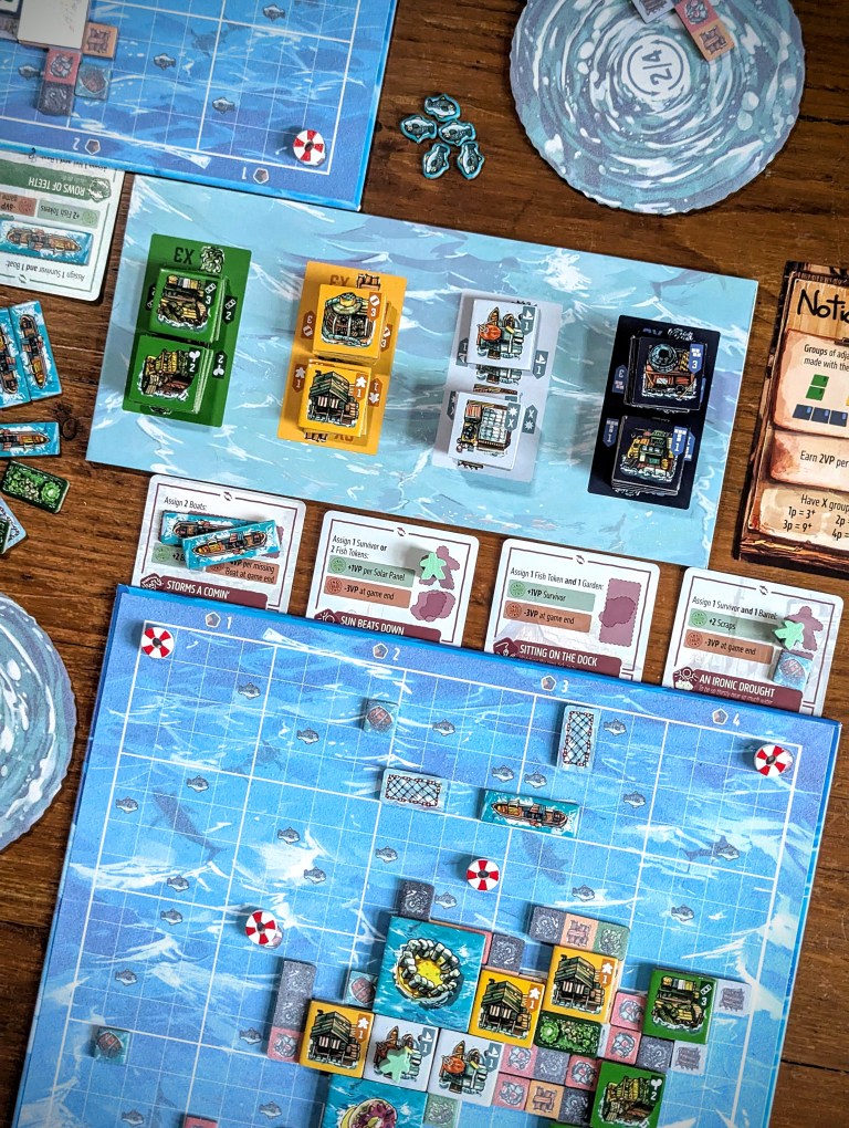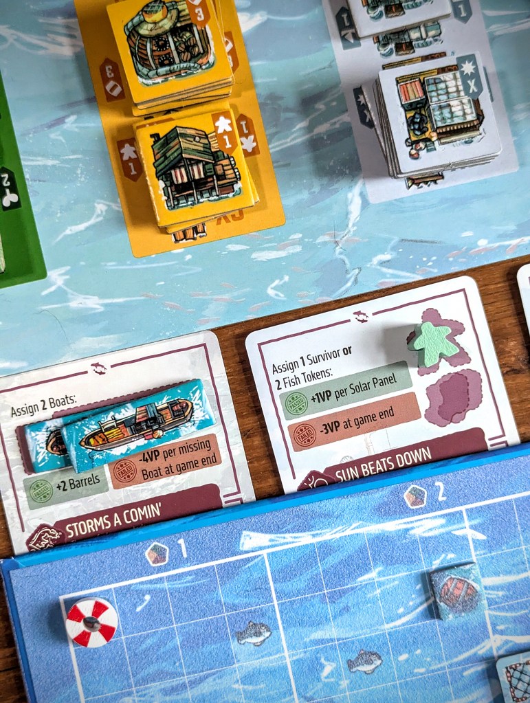 In cooperative mode, you also have the tricky challenge of making sure you can sustain the community you build, monitored through a resource tracker. Solar panels are required to deploy new boats. Rather than giving points, fish and gardens are essential to feed your community. If you don’t have enough at the end of each round for the number of survivors you’ve housed, you lose.