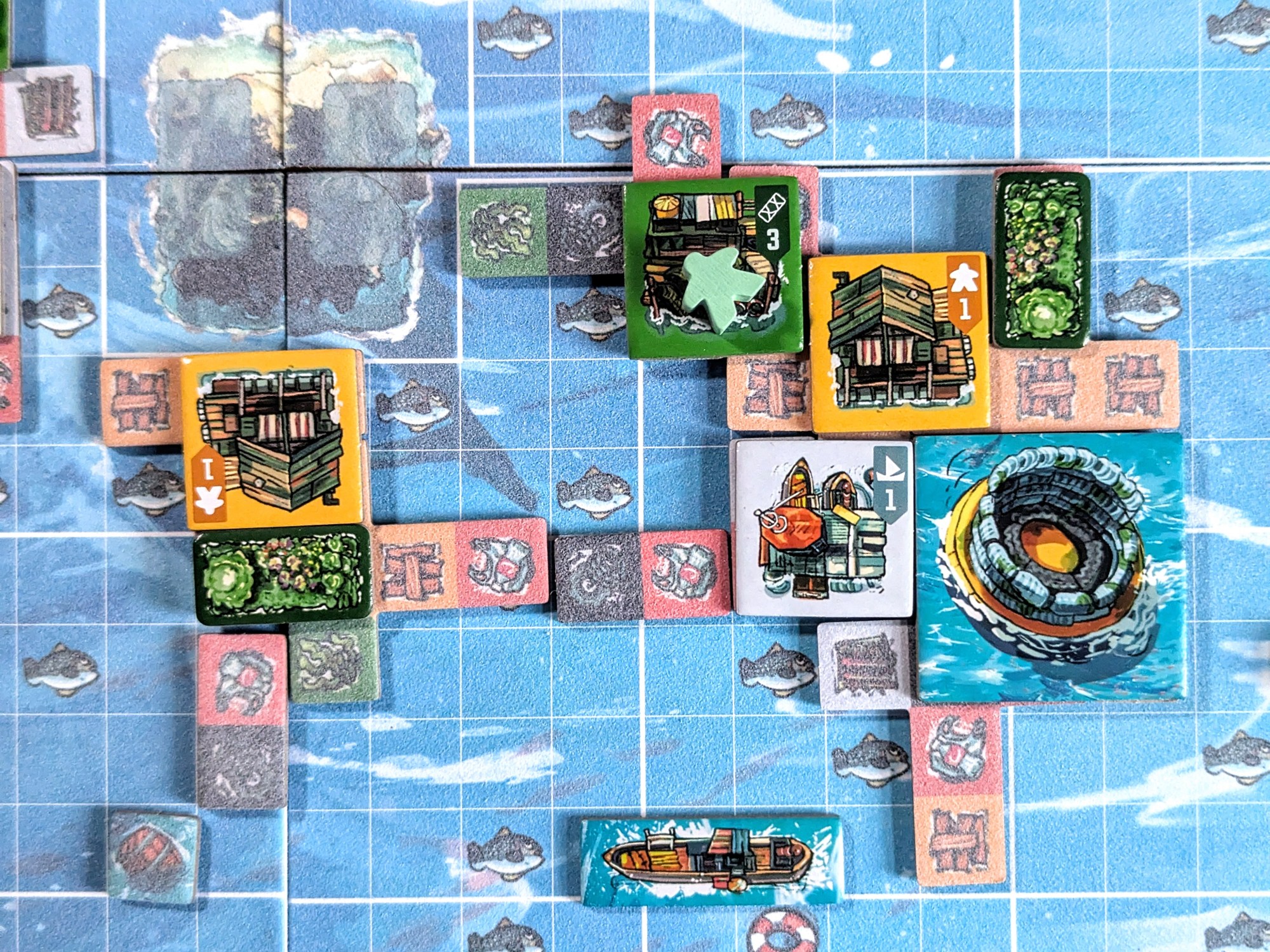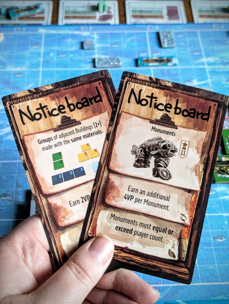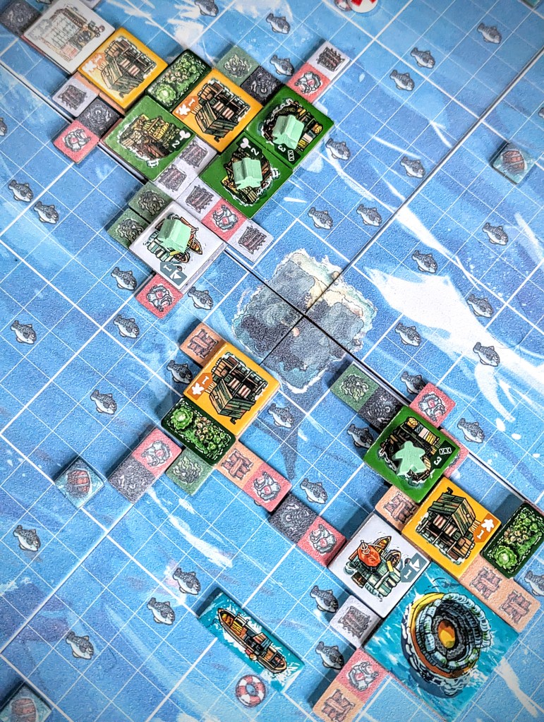 There are various Building effects to take advantage of: Boatyards and Net Workshops give you boats and nets to collect fish; Warehouses give you a bonus salvage tile; Scrapyards give you smaller scrap tiles; Coopers give you tiny barrels which act as wild salvage. Solar Panels and Greenhouses (which produce a garden) function differently depending on the mode you’re playing: in competitive mode they score endgame points (Solar Panels for adjacent water spaces, gardens for adjacent monuments), whereas in co-op they are important resources (more on this in a sec).